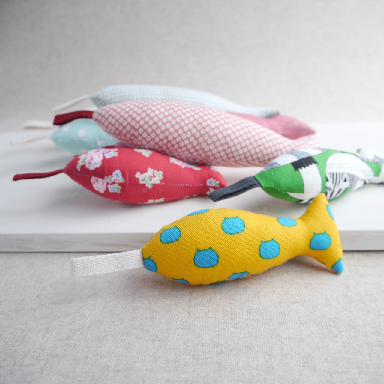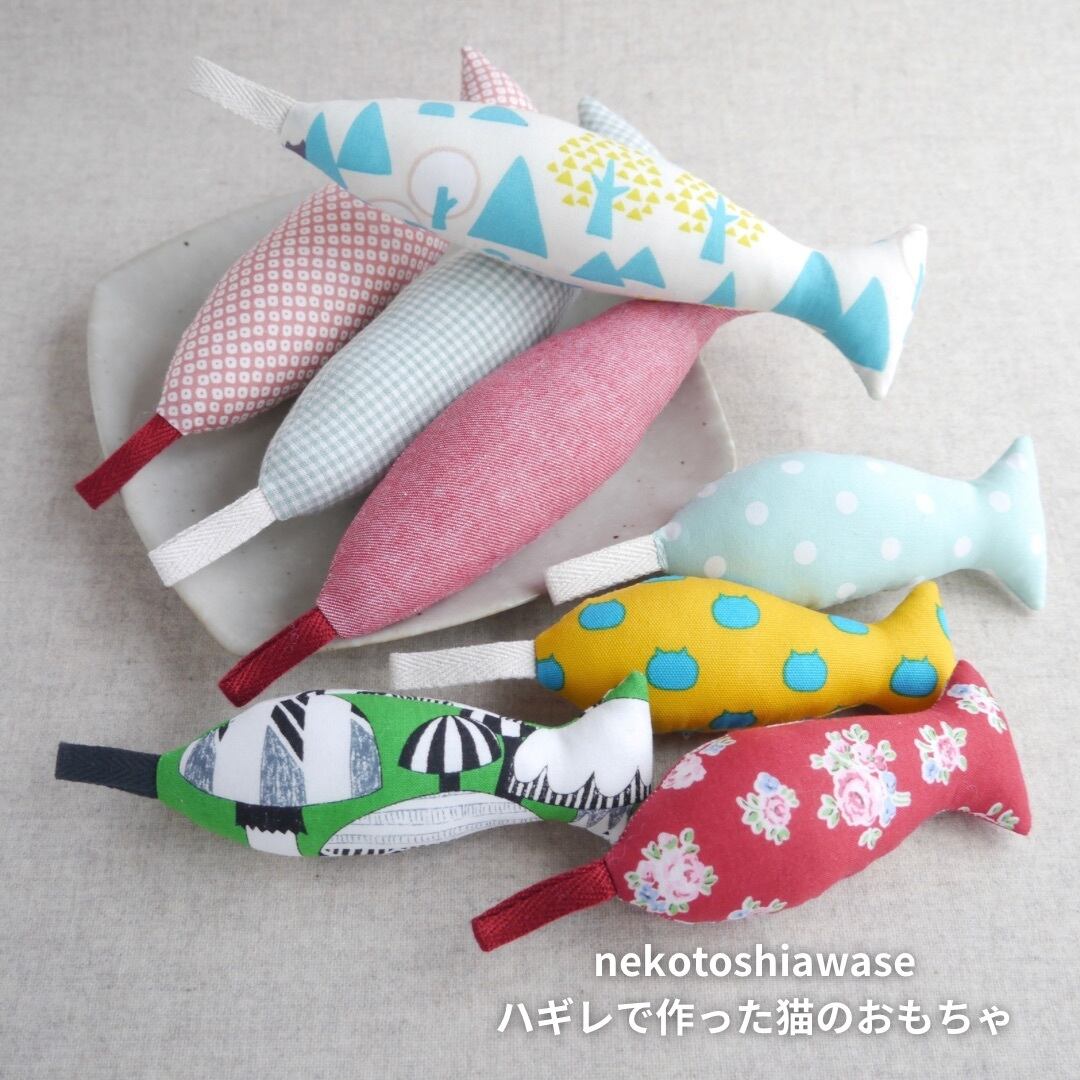猫ちゃんが遊べる、ハギレで作ったお魚のおもちゃです。